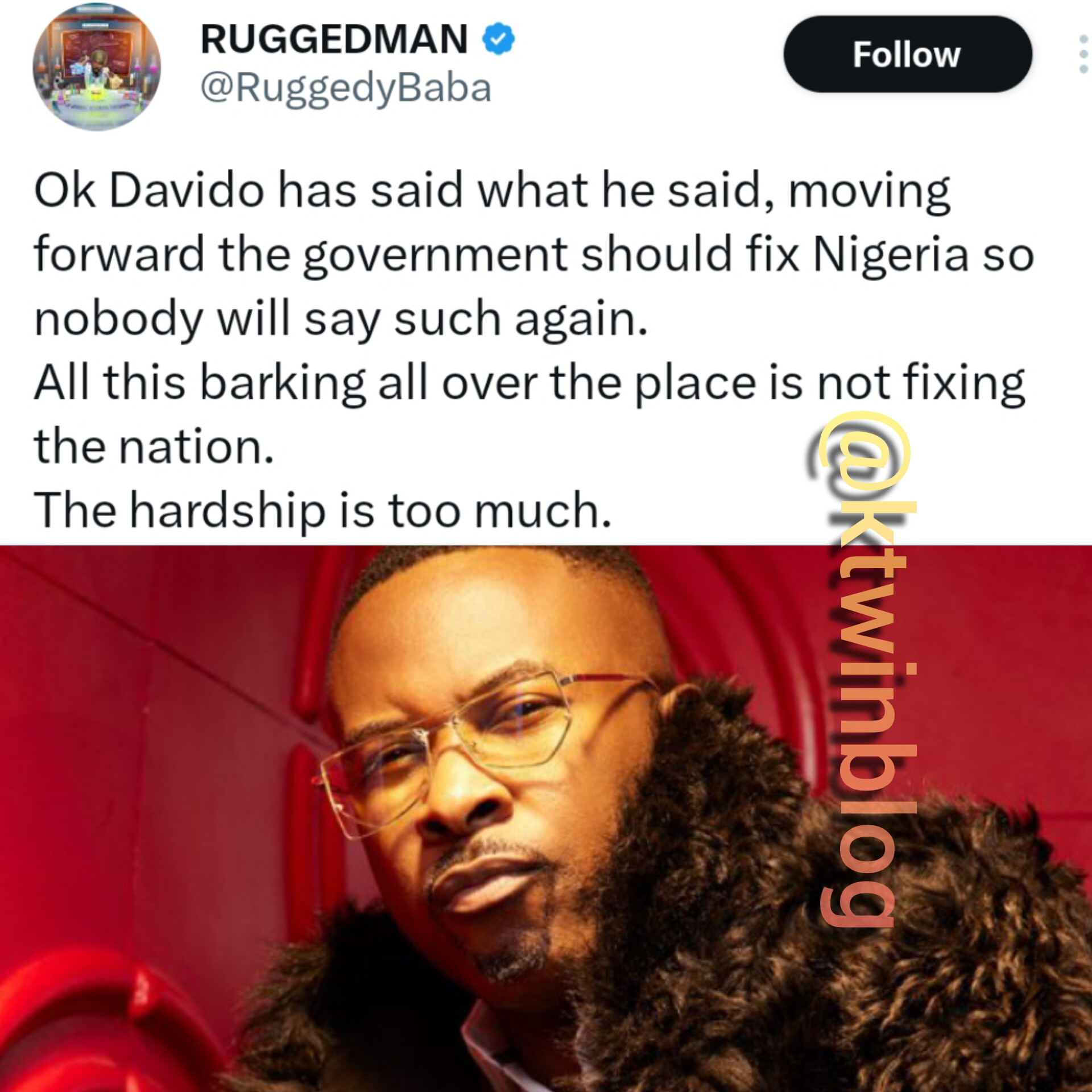 "Ok, Davido has said what he said. Moving forward, the government should fix Nigeria so nobody will say such again. All this barking all over the place is not fixing the nation. The hardship is too much," Ruggedman wrote.