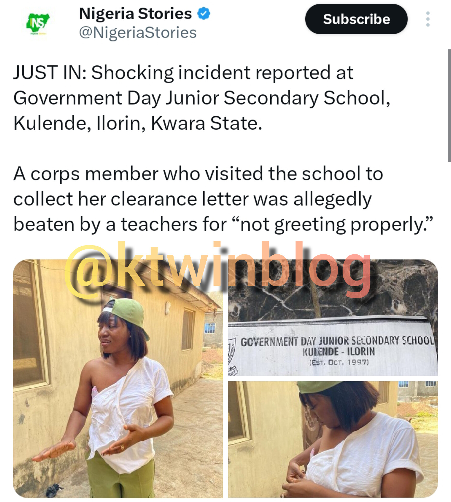 According to reports circulating on X (formerly Twitter), the altercation escalated into a physical confrontation, leaving the corps member with torn clothing. Eyewitnesses claim the issue began when the teacher felt disrespected by what was considered an improper greeting.